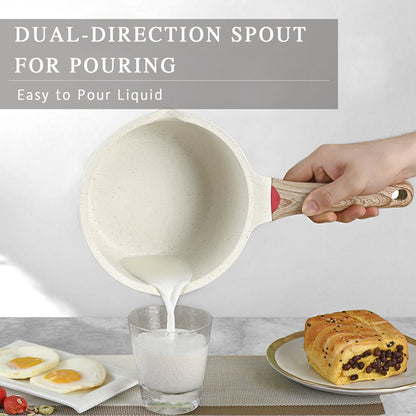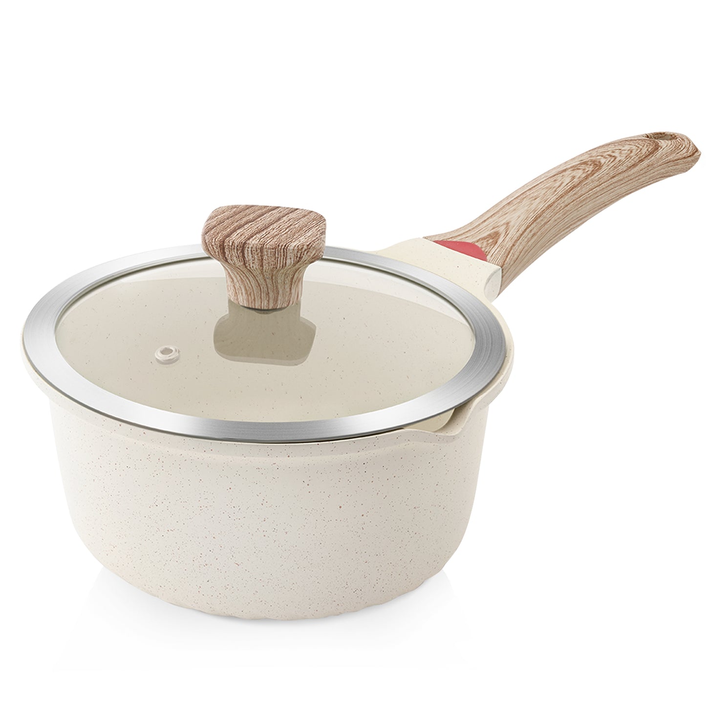 - Nonstick Sauce Pan with Lid - Our non stick milk pot coated with superior granite coating. The pan is no PFOS/PFOA, non-poisonous,safe and wellness. Easy to slide and clean food during cooking. With this prime sauce pan, you can make a healthier diet with less oil.