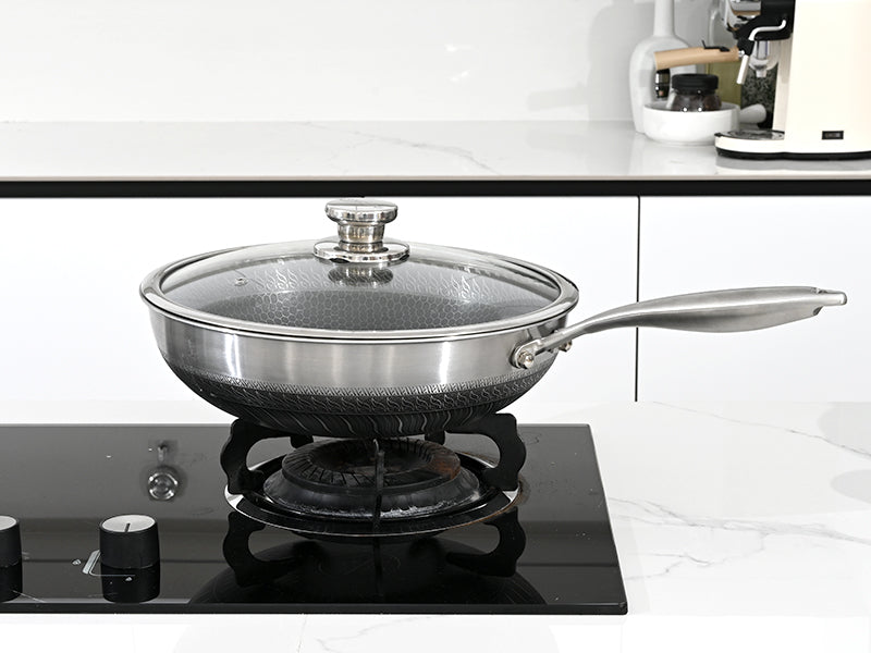 - Well Made Stainless Steel Wok - VINCHEF Wok made of food grade stainless steel with Germany imported Technology, without toxic chemicals and PFOA-free. With Anti-scratch technique makes this flat bottom wok,heat fast and evenly comfortable to move around. This stainless steel pan use ergonomic handle, the hollow metal handle will not heat up quickly. Coming with a glass lid with breathe hole, tight enough, everything rests in warmth. With a deep base is perfect for mixing without any spillage.
